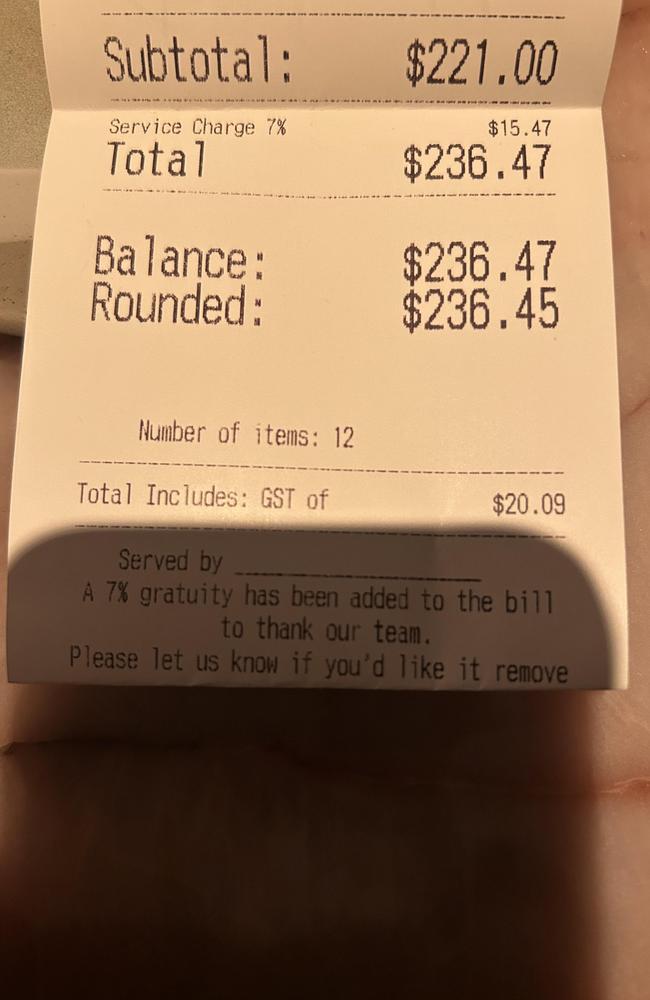 The customer had ordered 12 items, which came to a total of $221. But when they received the bill, they were shocked to see that a 7% gratuity had been added, taking the total to $236.45.